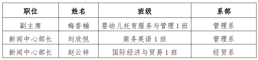 为进一步优化大学生自律委员会干部队伍建设,选拔一批政治质作能力强、勤于学习、乐于进取、甘于奉献、勇于创造的学 生骨干加入到大学生自律委员会中,有力促进学校学风建设、安全教育、学生日常管理与文化建设等各项工作的顺利开展,形成学生干部 培养锻炼长效机制。经研究决定,公开选聘 2021 届大学生自律委员会 学生干部。现将选聘结果公布如下: